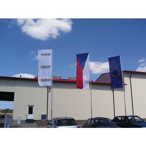Aluminiowe maszty flagowe z ramieniem obrotowym do zamocowania flagi. Maszty składają się z dwóch (5–6 m) lub trzech (7–10 m) elementów. Flagę wywiesza się i ściąga wysuwając i wsuwając poszczególne elementy. Anodowana powierzchnia zapewnia wyższą odporność na czynniki atmosferyczne. wysokość: 5—10 m średnica (na dole/pośrodku/na górze): 80/65/50 cm materiał: aluminium liczba segmentów: 2–3 mocowanie flagi: ramię obrotowe, taśmy plastikowe, obciążenie długość ramienia: 160 cm typ mocowania: zabetonowanie masa: 14,1 - 24,3 kg powierzchnia anodowana na srebrny kolor, w zestawie z obciążeniem, pochylaną stopką, uchwytami
