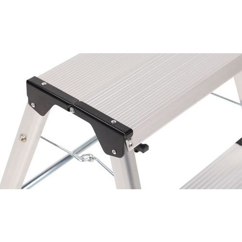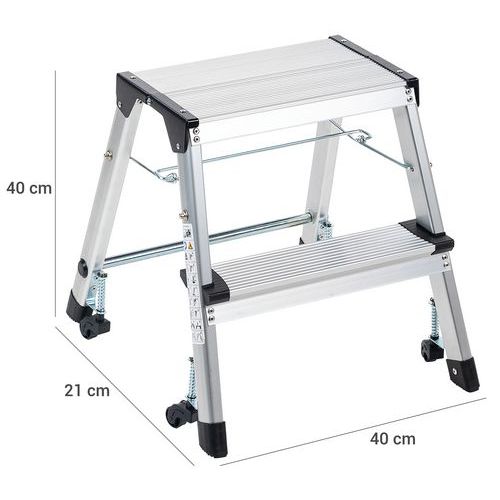 Składany stopień aluminiowy z dwoma stopniami Prążkowane, antypoślizgowe stopnie dla wygody użytkownika Łatwe przemieszczanie dzięki czterem samonakręcającym się kółkom.