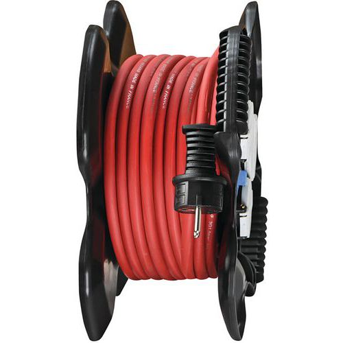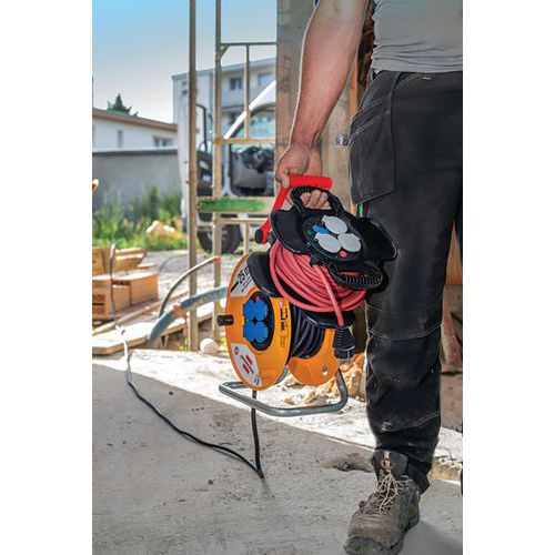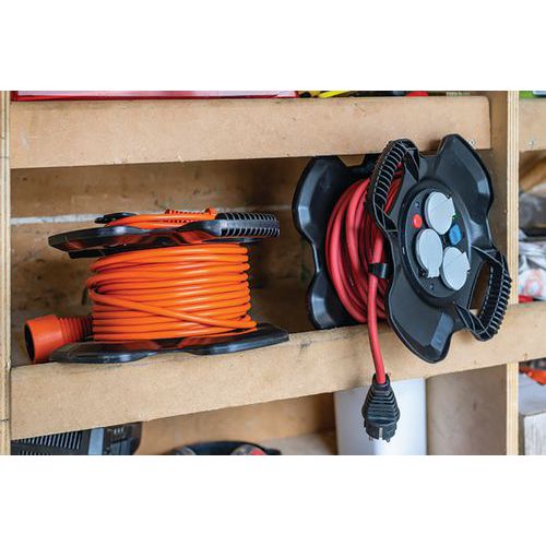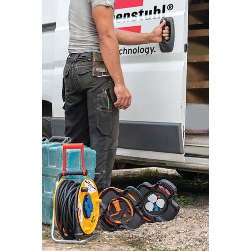 Bęben kablowy X-GUM z 3 szufladami i samodomykającymi się klapami. Podstawa z tworzywa sztucznego/gumy, wskaźnik napięcia LED, 2 gniazda USB z osłoną i bezpiecznikiem termicznym. Kabel odporny na węglowodory H07RN-F do użytku profesjonalnego. Stałe zasilanie Twojego urządzenia dzięki 2 złączom ładującym USB 5V/2,1A. Lekki, praktyczny i kompaktowy, z 2 zintegrowanymi uchwytami.