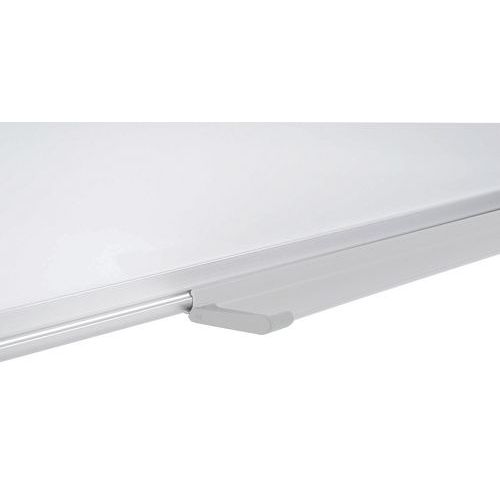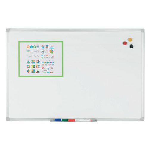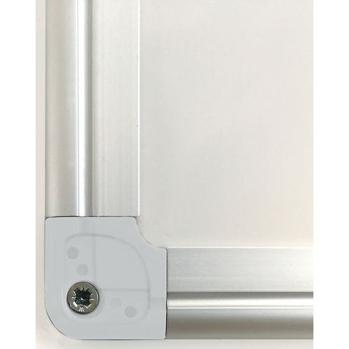 Białe tablice do zapisywania, z powierzchnią magnetyczną. Płyta tablicy ze stali lakierowanej. Aluminiowa rama z narożami plastikowymi. Ścierane na sucho za pomocą gąbki magnetycznej lub ściereczki. Plastikowa listwa do odkładania markerów i gąbki mocowana do ramy.