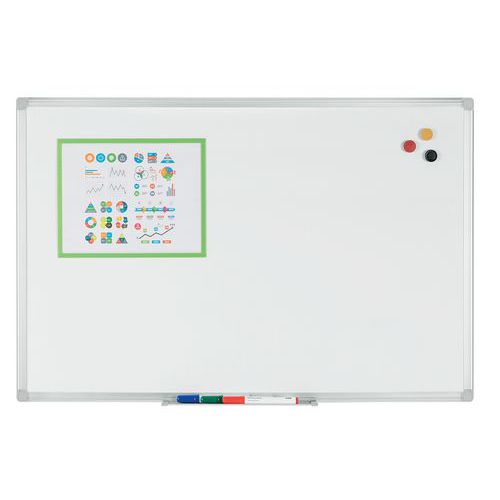 Lakierowana biała tablica do zapisywania. Magnetyczna – możliwość przymocowania dokumentów za pomocą magnesów. Wytrzymała aluminiowa rama. Łatwe ścieranie na sucho za pomocą ściereczki. Szybkie i łatwe mocowanie do ściany za pomocą schowanych nawierconych otworów. Magnetyczne Gwarancja producenta dla klienta : 10 lat