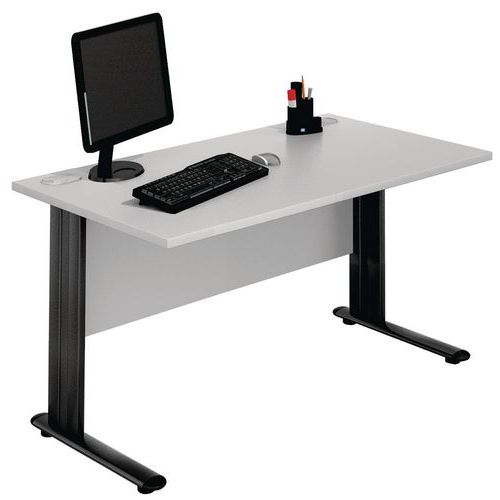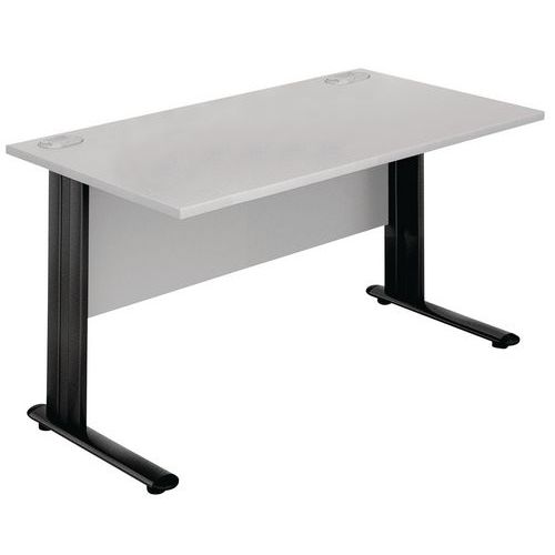 Biurka biurowe w kolorze jasnoszarym z blatem z płyty melaminowej o grubości 25 mm. Odblaskowa powłoka zapobiegająca zarysowaniom i właściwościom antybakteryjnym. Otwór w blacie o średnicy 80 mm do prowadzenia kabli. Metalowe nogi są wyposażone w zdejmowane osłony do zarządzania kablami. Dostarczane niezmontowane.