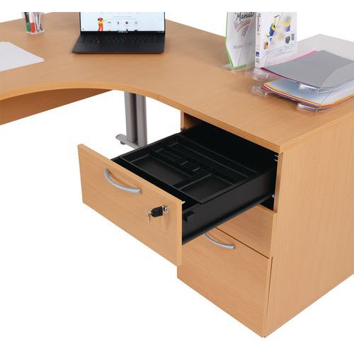 Ergonomiczne biurka Manutan Expert wyposażone w pojemnik.