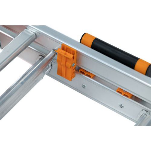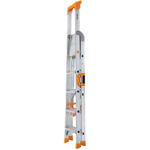 Drabinka składana aluminiowa z jednostronnym wejściem, przeznaczona do prac budowlanych lub do magazynu. Na jej boku znajduje się uchwyt ułatwiający przenoszenie oraz zabezpieczenie przed przypadkowym złożeniem podczas przemieszczania. Na poręczy zamocowana jest praktyczna półka na narzędzia i drobne przedmioty, np. uchwyt do wiadra itp. Antypoślizgowa rowkowana powierzchnia stopni, odległość pomiędzy stopniami wynosi 25 cm. Spełniają wymagania określone w EN 131-1, EN 131-2/A2, EN 131-3.