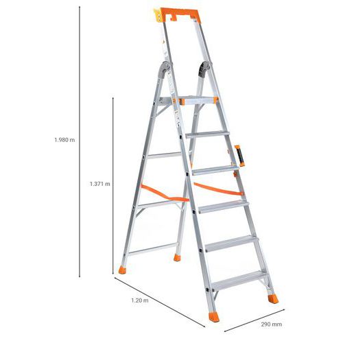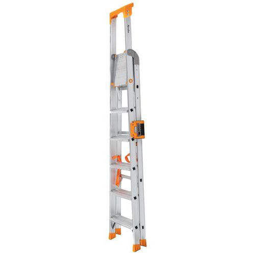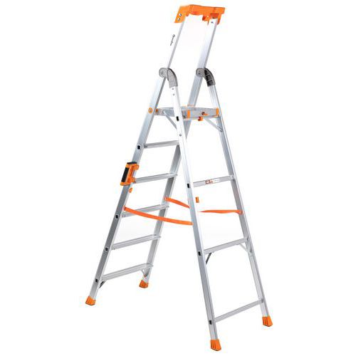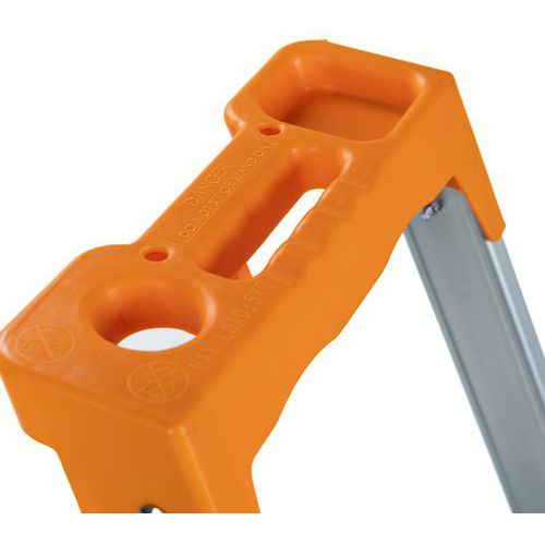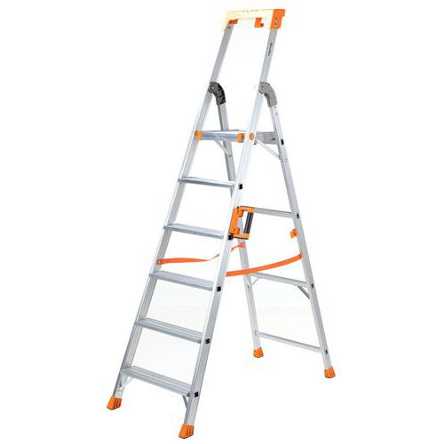 Drabinka składana aluminiowa z jednostronnym wejściem, przeznaczona do prac budowlanych lub do magazynu. Na jej boku znajduje się uchwyt ułatwiający przenoszenie oraz zabezpieczenie przed przypadkowym złożeniem podczas przemieszczania. Na poręczy zamocowana jest praktyczna półka na narzędzia i drobne przedmioty, np. uchwyt do wiadra itp. Antypoślizgowa rowkowana powierzchnia stopni. Odległość pomiędzy stopniami wynosi 25 cm. Spełniają wymagania określone w EN 131-1, EN 131-2/A2, EN 131-3.