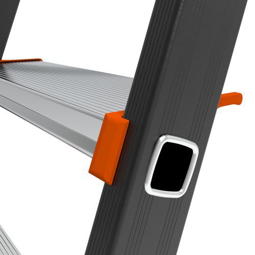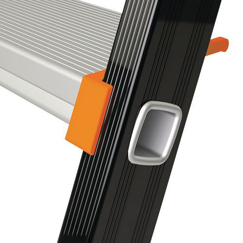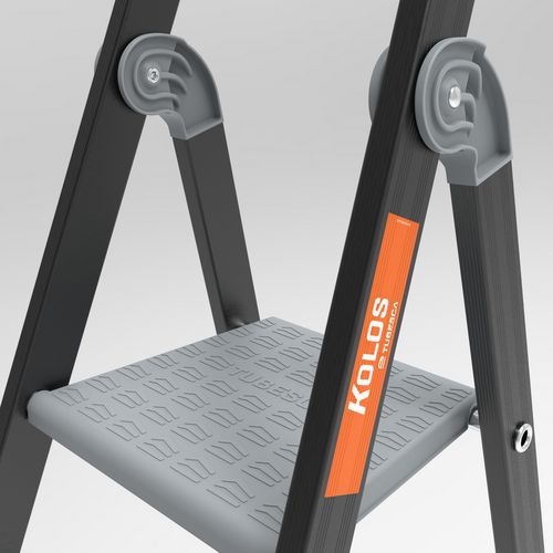 Dzięki stopniom o szerokości 110 mm, zawiasom z odlewów aluminium i wzmocnionym podłużnicom drabinki Kolos odznaczają się wytrzymałością i komfortem użytkowania. Profilowane, antypoślizgowe schodki z wytłaczanego aluminium. Jednoczęściowe zawiasy wykonane z żebrowanego, wysoce wytrzymałego odlewu aluminium. Uchwyt na narzędzia z zamknięciem. Podest 280 x 250 mm. 2 czarne pasy do modeli z 7 i 8 stopniami. Powłoka epoksydowa w kolorze antracytowo-szarym.