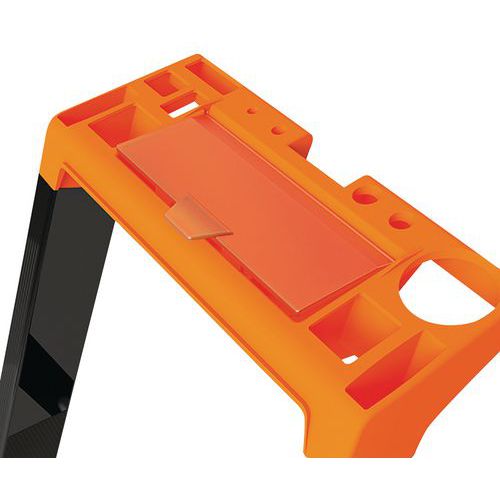 Dzięki stopniom o szerokości 110 mm, zawiasom z odlewów aluminium i wzmocnionym podłużnicom drabinki Kolos odznaczają się wytrzymałością i komfortem użytkowania. Profilowane, antypoślizgowe schodki z wytłaczanego aluminium. Jednoczęściowe zawiasy wykonane z żebrowanego, wysoce wytrzymałego odlewu aluminium. Uchwyt na narzędzia z zamknięciem. Podest 280 x 250 mm. 2 czarne pasy do modeli z 7 i 8 stopniami. Powłoka epoksydowa w kolorze antracytowo-szarym.