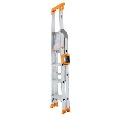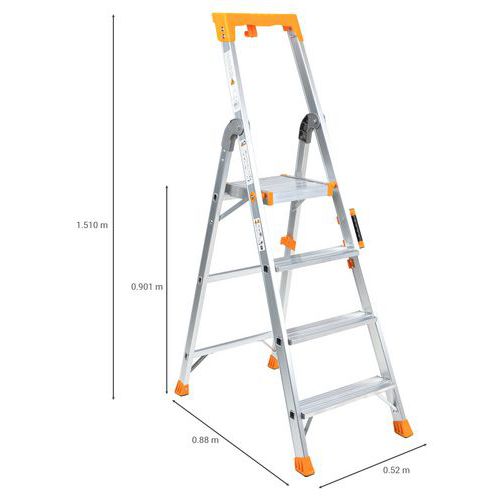 Drabinka składana aluminiowa z jednostronnym wejściem, przeznaczona do prac budowlanych lub do magazynu. Na jej boku znajduje się uchwyt ułatwiający przenoszenie oraz zabezpieczenie przed przypadkowym złożeniem podczas przemieszczania. Na poręczy zamocowana jest praktyczna półka na narzędzia i drobne przedmioty, np. uchwyt do wiadra itp. Antypoślizgowa rowkowana powierzchnia stopni, odległość pomiędzy stopniami wynosi 25 cm. Spełniają wymagania określone w EN 131-1, EN 131-2/A2, EN 131-3.