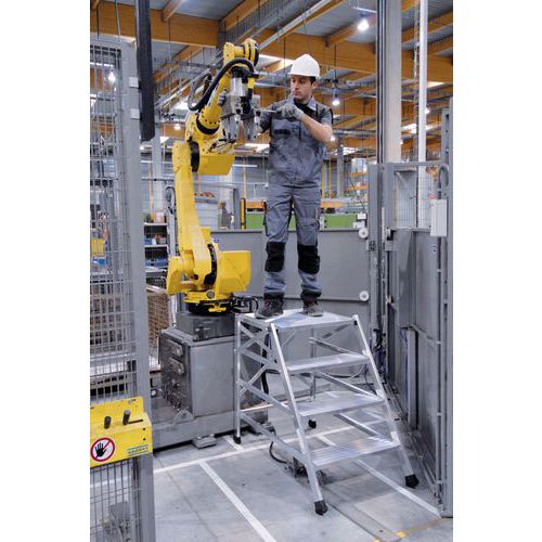 Bardzo szerokie aluminiowe drabiny wyposażone w stopnie o grubości 200 mm i podest o wymiarach 600 x 600 mm zapewniają możliwość pracy na wysokości od 0,49 do 0,97 m. Dzięki wzmocnionej konstrukcji, stopniom, żebrowanemu podestowi oraz solidnym podkładkom drabinka zapewnia wysokie bezpieczeństwo. Produkt ten stanowi ułatwienie dostępu, nie należy go używać w charakterze stanowiska pracy. Do wyboru są modele mobilne (z kółkami) oraz stacjonarne (bez kółek).