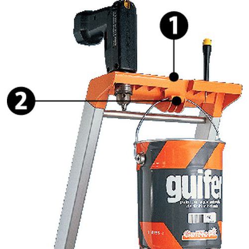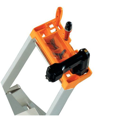 - W zestawie uchwyt na narzędzia z hakiem na wiadro i zamykana przegródka na śruby.