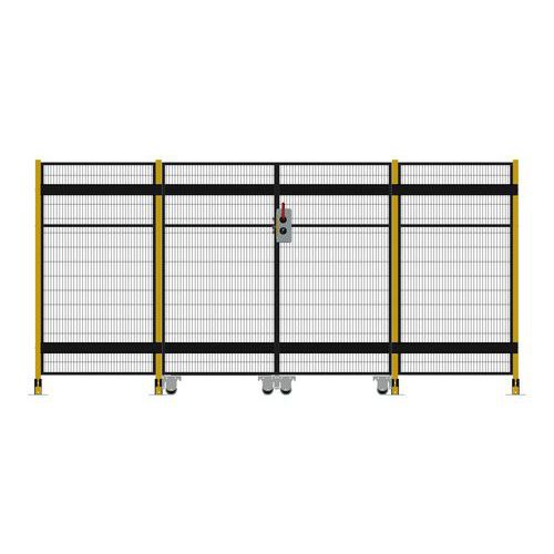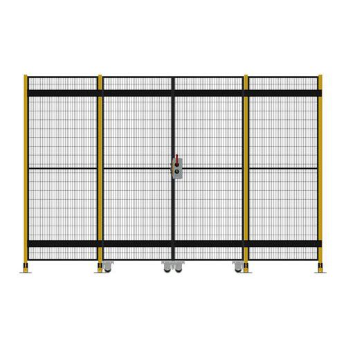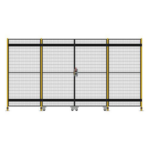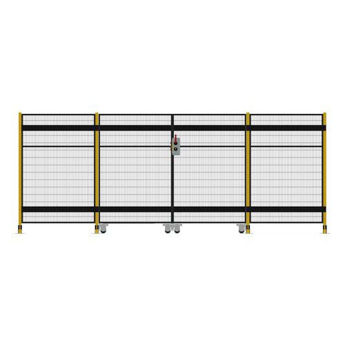 Kompletne dwuskrzydłowe drzwi przesuwne z zamkiem cylindrycznym do systemu ogrodzeń zabezpieczających.
