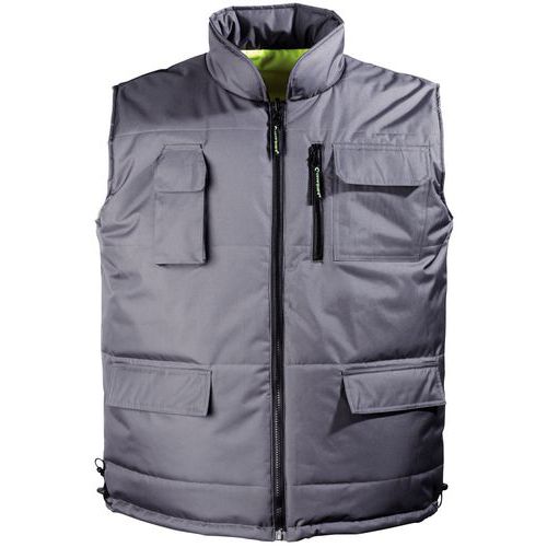 - Jedna strona ma 2 naszyte paski odblaskowe, druga jest w kolorze szarym.