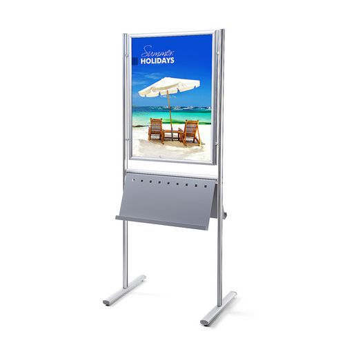 Dwustronne stojaki informacyjne z ramą na plakaty. W części dolnej znajduje się przestrzeń do umieszczenia blaszanych kieszeni na broszury, katalogi i inne prospekty. Rama zatrzaskowa z ostrymi rogami i profilem 25 mm. Wyprodukowany w UE
