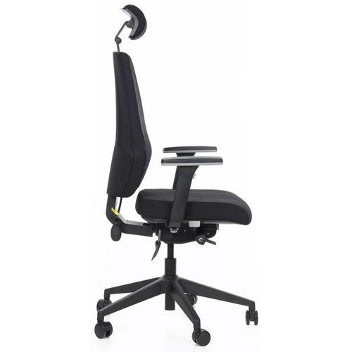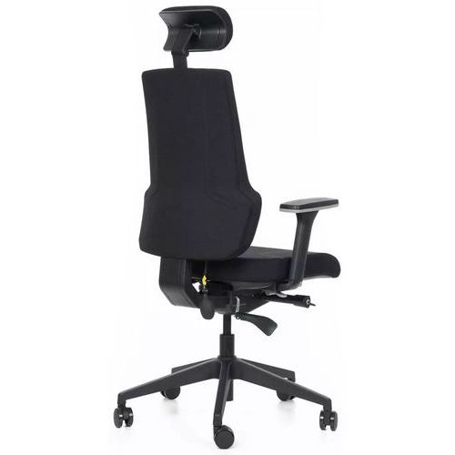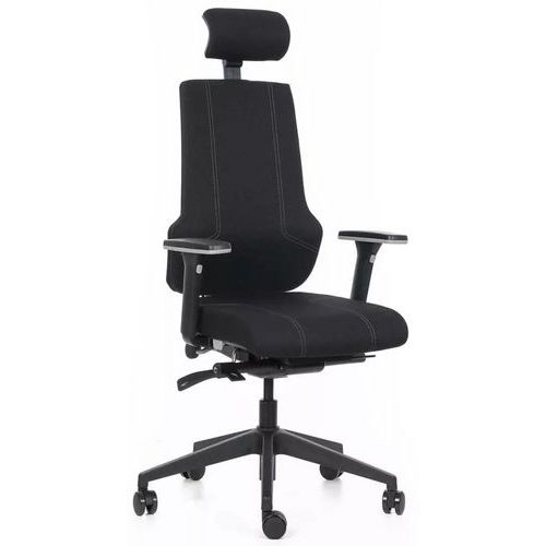 Ergonomiczny fotel biurowy z wyposażeniem ułatwiającym długotrwałą pracę w pozycji siedzącej.