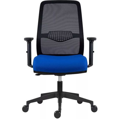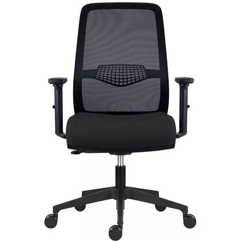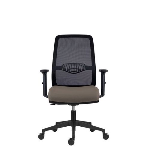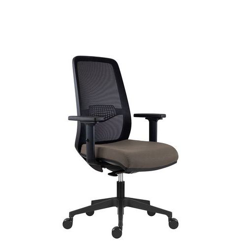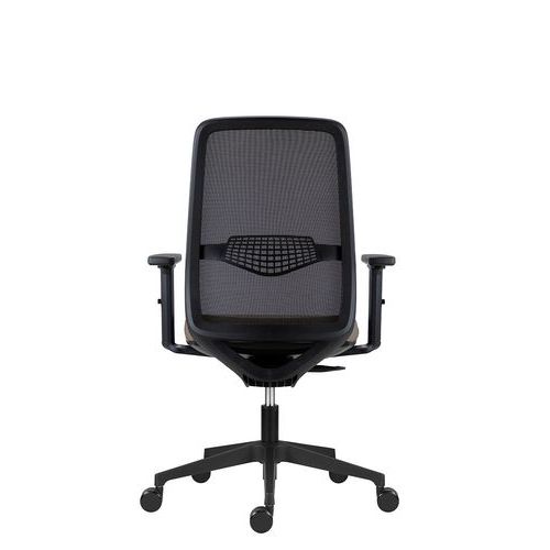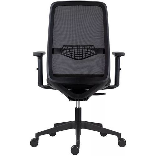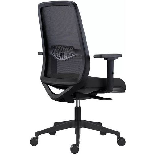 Fotel biurowy Tulio z czarną siatką na oparciu, wyposażony w regulowane podparcie lędźwiowe.