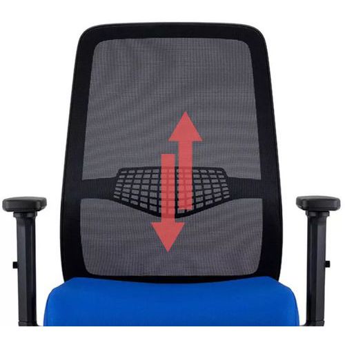 Fotel biurowy Tulio z czarną siatką na oparciu, wyposażony w regulowane podparcie lędźwiowe.