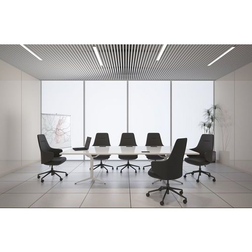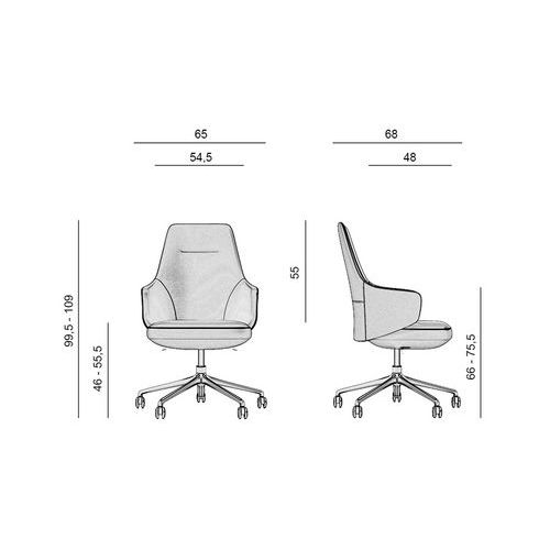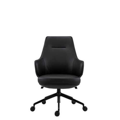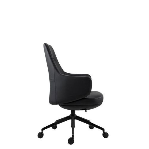 - W całości tapicerowany, luksusowy fotel z oparciem średniej wysokości i zintegrowanymi tapicerowanymi podłokietnikami.