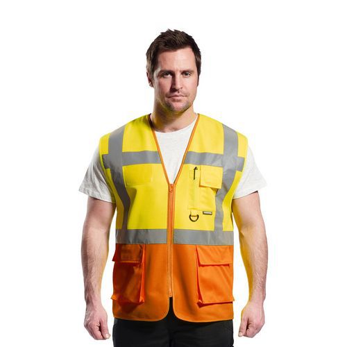 Rewolucyjny design kamizelki Executive łączy lekkość standardowej kamizelki z walorami użytkowymi kurtki. Posiada liczne kieszenie zaczep na klucze i miejsce na identyfikator. Zapinana na zamek błyskawiczny. Kombinacja dwóch kolorów ostrzegawczych żółtego i pomarańczowego daje znakomita kontrastową widoczność wymaganą przy wielu pracach.