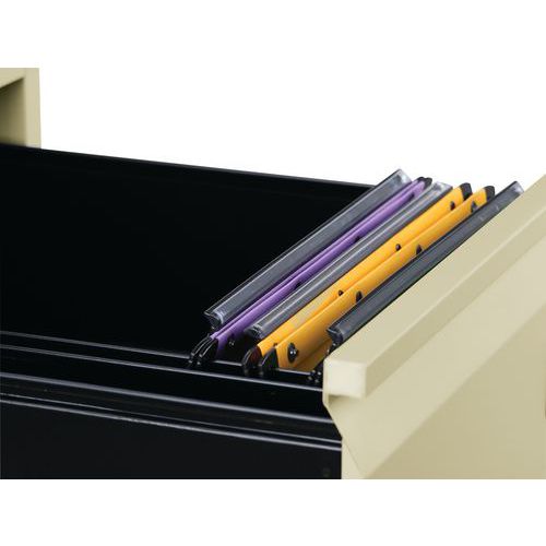 Kartoteki na teczki zawieszane formatu A4 folio. Zabezpieczenie przed wysunięciem dwóch lub większej liczby szuflad naraz. Szuflady ze 100% wysuwem wyposażone w standardowe dno. Uchwyt w szufladach można przystosować do szerokości teczki zawieszanej. Zamek centralny.