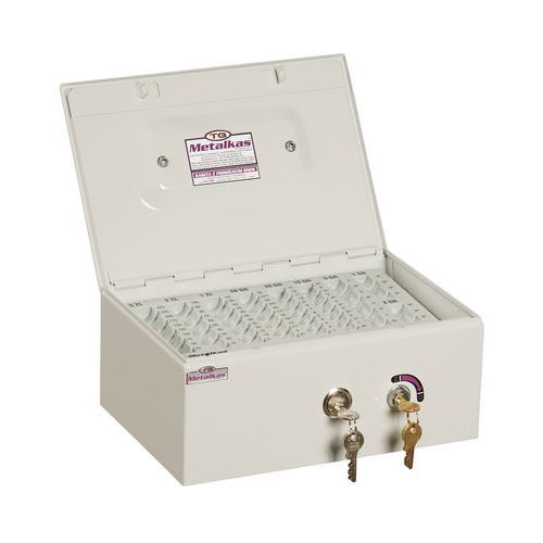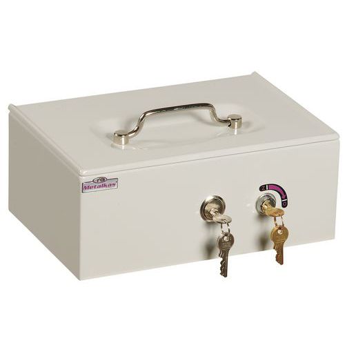 - Mała kasetka na pieniądze wyprodukowana z lakierowanego proszkowo metalu odpornego na zarysowania