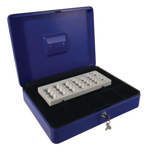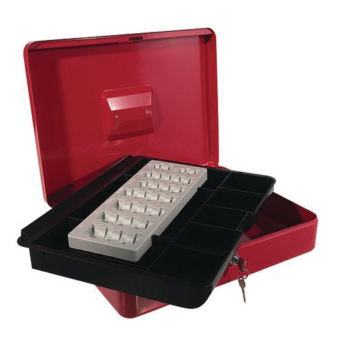 Podręczne metalowe kasetki w różnych wariantach kolorystycznych, z uchwytem górnym. Zawierają wyciągany organizer z trzema przegródkami oraz wkład na monety euro (1, 2 euro, 1, 2, 5, 10, 20 i 50 centów). kolor: niebieski, czarny, czerwony materiał: stal wymiary: wys. x szer. x gł.: 95 x 370 x 285 mm zamek: cylindryczny (2 klucze)