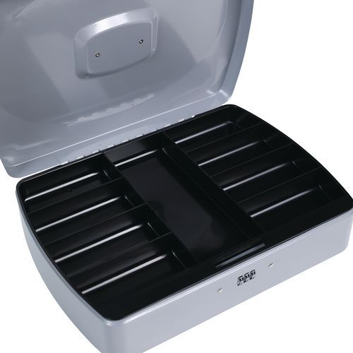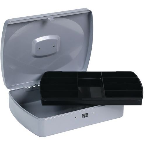 Kasetki przenośne z zamkiem na kod, w różnych wariantach kolorystycznych. Posiadają wyciągany organizer wyposażony w dziewięć przegródek.