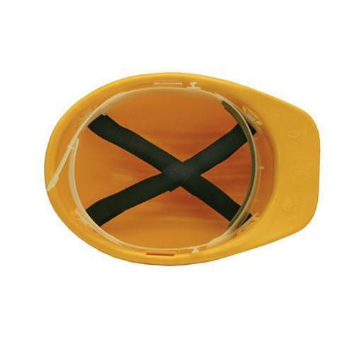 Kask roboczy dielektryczny z HDPE, z czteropunktowym mocowaniem tekstylnym.