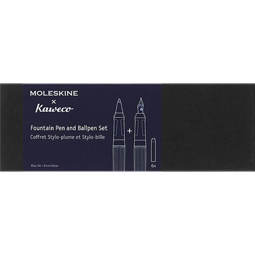 Zestaw prezentowy zawiera pióro wieczne Kaweco z pozłaconą stalówką w rozmiarze M i sześcioma standardowymi nabojami Kaweco, a także długopis Kaweco z niebieskim wkładem typu G2 o grubości 1,0 mm. Te eleganckie produkty są sprzedawane razem w metalowym etui w stylu vintage, które można wykorzystać jako piórnik.