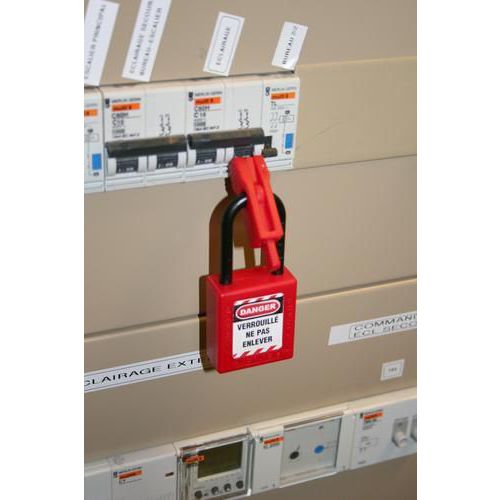 Kłódki typu Lock-Out w bogatej gamie kolorystycznej. Nieprzewodzący korpus z tworzywa ABS. Kabłąk z nylonu. Podwójne ryglowanie. Kłódki odporne na wstrząsy, wysokie temperatury, korozję. Idealne do urządzeń elektrycznych. materiał korpusu: tworzywo ABS nieprzewodzące materiał kabłąka: nylon szerokość: 40 mm wymiary kabłąka: fi 6 x 38 mm 1 klucz