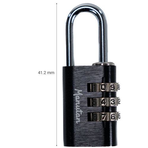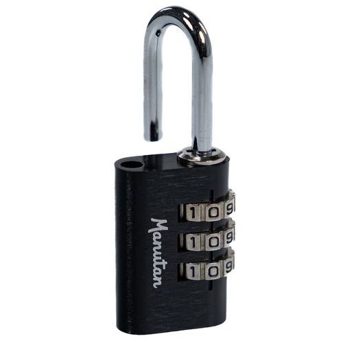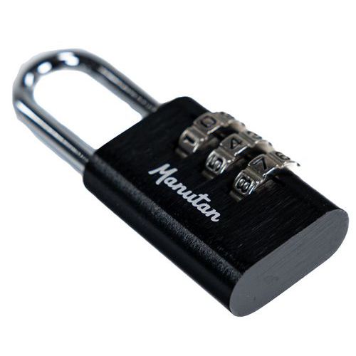 Kłódki szyfrowe zabezpieczające Manutan Expert. Ustawianie kombinacji cyfrowej za pomocą trzech tarcz. Aluminiowy korpus ze stalowym jarzmem wysokiej jakości.