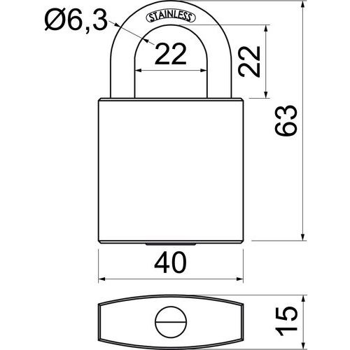 Kłódka ze stali nierdzewnej o delikatnie szczotkowanej powierzchni, średnica pałąka 6 mm, wysokość 22 mm