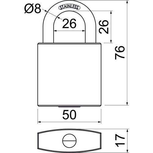 Kłódka ze stali nierdzewnej z drobno szczotkowanym wykończeniem, średnica pałąka 8 mm, wysokość 26 mm