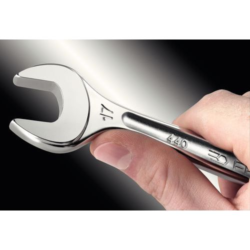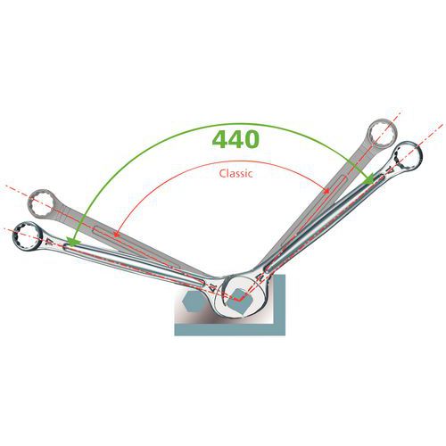 Profil OGV® dla łatwiejszego dokręcania i ochrony nakrętek. Wąskie główki dla łatwego dostępu. Klucz płasko-oczkowy 30°. Ergonomiczny uchwyt. Większy komfort: uchwyt o przekroju podwajającym powierzchnię podparcia dłoni. Lepszy dostęp do nakrętek połączonych szeregowo lub częściowo wpuszczonych dzięki 15° krzywiźnie łba. Łatwiejsze dokręcanie.