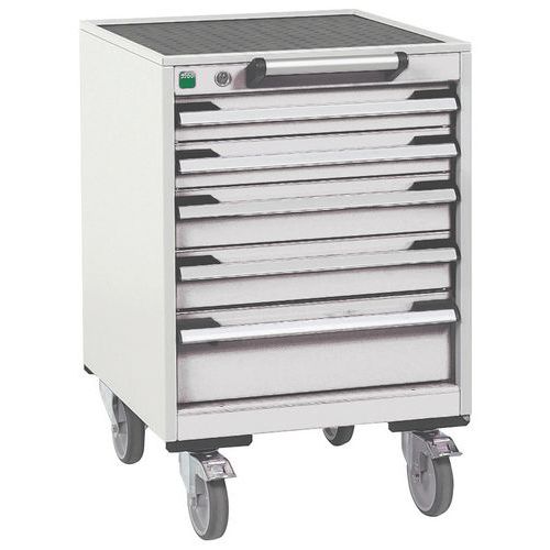 Przenośne szafki z szufladami Bott Cubio z górną powierzchnią roboczą o grubości 2 cm typu multiplex/linoleum lub składaną blachą z matą. Nośność do 300 kg, solidna spawana konstrukcja stalowa, malowana proszkowo. Szuflady z centralnym zamkiem o wysokości 2 7,5 cm.