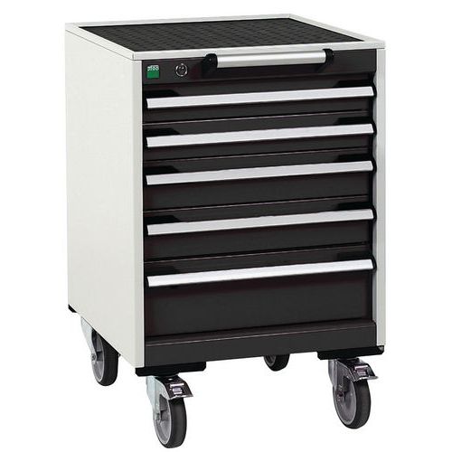 Przenośne szafki z szufladami Bott Cubio z górną powierzchnią roboczą o grubości 2 cm typu multiplex/linoleum lub składaną blachą z matą. Nośność do 300 kg, solidna spawana konstrukcja stalowa, malowana proszkowo. Szuflady z centralnym zamkiem o wysokości 2 7,5 cm.