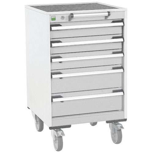Mobilne szafki z szufladami Bott Cubio z górną powierzchnią roboczą o grubości 2 cm, typu multiplex/linoleum lub blacha składana z matą. Nośność do 300 kg, solidna spawana konstrukcja stalowa, malowana proszkowo. Szuflady z centralnym zamkiem o wysokości 200 cm 3 x 10 i 2 x 15 cm, o nośności 50 kg i 100% wysuwu na łożyskach rolkowych. Ergonomiczne uchwyty do szuflad z etykietą, na której można pisać, system blokady umożliwiający otwieranie kilku szuflad jednocześnie. Dwie stałe oraz dwa obrotowe koła z hamulcem o średnicy 12,5 cm.