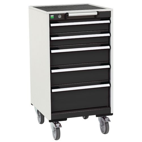 Przenośne szafki z szufladami Bott Cubio z górną powierzchnią roboczą o grubości 2 cm typu multiplex/linoleum lub składaną blachą z matą. Nośność do 300 kg, solidna spawana konstrukcja stalowa, malowana proszkowo. Szuflady zamykane centralnie o wysokości 2 x 10, 2 x 15 i 1 x 20 cm, nośność 50 kg i 100% wysuwu na łożyskach rolkowych. Ergonomiczne uchwyty do szuflad z miejscem na opis, system blokady umożliwiający otwieranie kilku szuflad jednocześnie. Dwa kółka stałe i dwa obrotowe z hamulcem o średnicy 12,5 cm. Maks. obciążenie (kg) : 300 kg