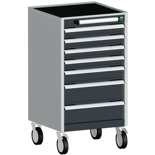 Mobilne szafki z szufladami Bott Cubio z górną powierzchnią roboczą o grubości 2 cm, typu multiplex/linoleum lub blacha składana z matą. Nośność do 300 kg, solidna spawana konstrukcja stalowa, malowana proszkowo. Szuflady z centralnym zamkiem o wysokości 200 cm 4 x 7,5, 1 x 10 i 2 x 15 cm, o nośności 50 kg i 100% wysuwu na łożyskach rolkowych. Ergonomiczne uchwyty do szuflad z etykietą z możliwością napisania, system blokady otwarcia kilku szuflad jednocześnie. Dwa koła stałe i dwa skrętne z hamulcem o średnicy 12,5 cm.
