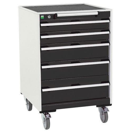 Przenośne szafki z szufladami Bott Cubio z górną powierzchnią roboczą o grubości 2 cm typu multiplex/linoleum lub składaną blachą z matą. Nośność do 300 kg, solidna spawana konstrukcja stalowa, malowana proszkowo. Szuflady zamykane centralnie o wysokości 2 x 10, 2 x 15 i 1 x 20 cm, nośność 50 kg i 100% wysuwu na łożyskach rolkowych. Ergonomiczne uchwyty do szuflad z miejscem na opis, system blokady umożliwiający otwieranie kilku szuflad jednocześnie. Dwa kółka stałe i dwa obrotowe z hamulcem o średnicy 12,5 cm. Maks. obciążenie (kg) : 300 kg