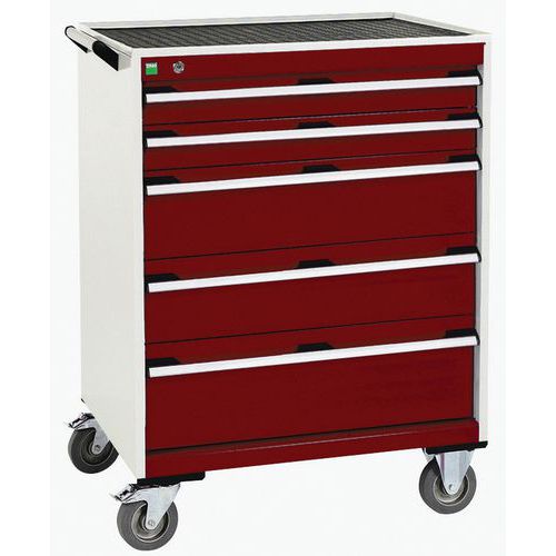 Mobilne szafki z szufladami Bott Cubio z górną powierzchnią roboczą o grubości 2 cm, typu multipleks/linoleum lub blacha składana z matą. Nośność do 600 kg, solidna spawana konstrukcja stalowa, malowana proszkowo. Szuflady z centralnym zamkiem o wysokości 200 cm 2 x 10, 2 x 15 i 1 x 20 cm, nośność 50 kg i 100% wysuw na łożyskach rolkowych. Ergonomiczne uchwyty do szuflad z miejscem na opis, system blokady umożliwiający otwieranie kilku szuflad jednocześnie. Dwie stałe i dwie szuflady dwa obrotowe kółka z hamulcem o średnicy 12,5 cm. Maks. obciążenie (kg) : 600 kg