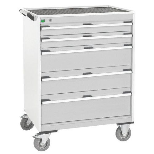 Mobilne szafki z szufladami Bott Cubio z górną powierzchnią roboczą o grubości 2 cm, typu multipleks/linoleum lub blacha składana z matą. Nośność do 600 kg, solidna spawana konstrukcja stalowa, malowana proszkowo. Szuflady z centralnym zamkiem o wysokości 200 cm 2 x 10, 2 x 15 i 1 x 20 cm, nośność 50 kg i 100% wysuw na łożyskach rolkowych. Ergonomiczne uchwyty do szuflad z miejscem na opis, system blokady umożliwiający otwieranie kilku szuflad jednocześnie. Dwie stałe i dwie szuflady dwa obrotowe kółka z hamulcem o średnicy 12,5 cm. Maks. obciążenie (kg) : 600 kg