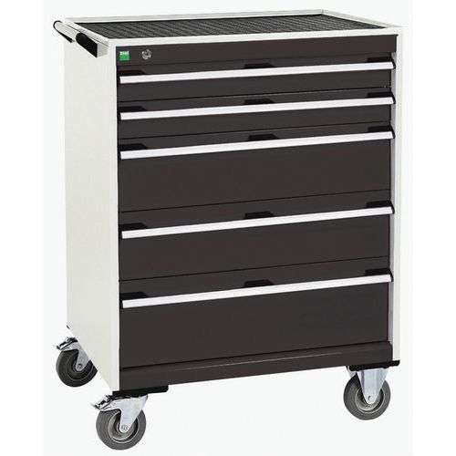Mobilne szafki z szufladami Bott Cubio z górną powierzchnią roboczą o grubości 2 cm, typu multipleks/linoleum lub blacha składana z matą. Nośność do 600 kg, solidna spawana konstrukcja stalowa, malowana proszkowo. Szuflady z centralnym zamkiem o wysokości 200 cm 2 x 10, 2 x 15 i 1 x 20 cm, nośność 50 kg i 100% wysuw na łożyskach rolkowych. Ergonomiczne uchwyty do szuflad z miejscem na opis, system blokady umożliwiający otwieranie kilku szuflad jednocześnie. Dwie stałe i dwie szuflady dwa obrotowe kółka z hamulcem o średnicy 12,5 cm. Maks. obciążenie (kg) : 600 kg