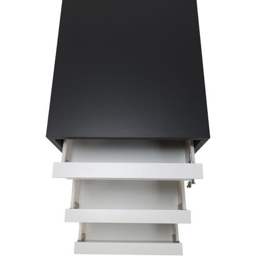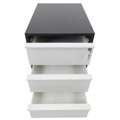 Mobilny pojemnik Misao wykonany z melaminy z krawędziami o grubości 1 mm. Dolna szuflada na teczki wiszące. Wysokość szuflady 8,6 cm, szerokość 50 cm. Szuflada na dokumenty wiszące, odpowiednia do segregatorów w formacie A4 i foilscap. Centralny zamek bez zabezpieczenia przed dachowaniem. Uchwyt wykonany z anodowanego profilu aluminiowego. Maksymalne obciążenie każdej szuflady: 25 kg. Kółka obrotowe o średnicy 37 mm.