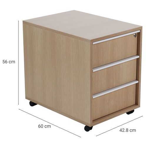 Mobilny pojemnik Misao wykonany z melaminy z krawędziami o grubości 1 mm. Dolna szuflada na teczki wiszące. Wysokość szuflady 8,6 cm, szerokość 50 cm. Szuflada na dokumenty wiszące, odpowiednia do segregatorów w formacie A4 i foilscap. Centralny zamek bez zabezpieczenia przed dachowaniem. Uchwyt wykonany z anodowanego profilu aluminiowego. Maksymalne obciążenie każdej szuflady: 25 kg. Kółka obrotowe o średnicy 37 mm.