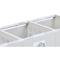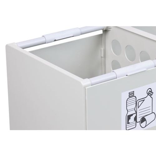 Modułowe kontenery plastikowe na odpady segregowane. Wykonane z odpornego na uderzenia poliestru w kolorze szarym RAL 7035. Możliwość wyboru wariantu z 1, 2, 3 lub 4 koszami. Łatwe opróżnianie kosza za pomocą pojemnika wewnętrznego (brak w zestawie). Możliwość uzupełnienia o podstawę mobilną oraz kolorowe pokrywy. Sprzedawane z piktogramami samoprzylepnymi do segregacji odpadów.
