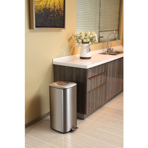 - Kwadratowy pedałowy kosz na kosmetyki ze szczotkowanej stali nierdzewnej z wykończeniem zapobiegającym pozostawianiu odcisków palców.