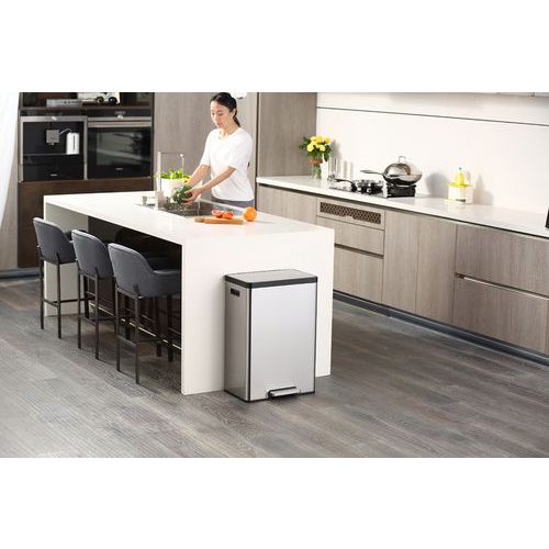 Wyposażony w miękko zamykającą się pokrywę i dwie syntetyczne wkładki (2x20L) do selektywnego sortowania.