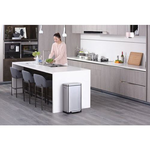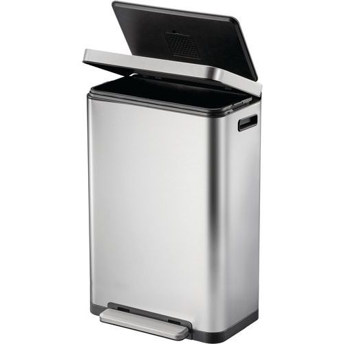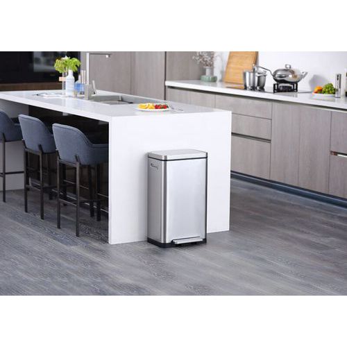 - Elegancki prostokątny kosz na śmieci z bardzo szerokim pedałem, plastikową wkładką, pokrywą z funkcją cichego zamykania i blokadą otwarcia.