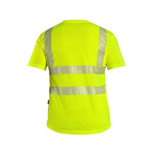 Męska koszulka o wysokiej widoczności z krótkim rękawem, okrągłym dekoltem, taśmą wzmacniającą na karku, szwami bocznymi, siateczką pod pachami, segmentowymi paskami odblaskowymi: 2 poziomymi, 2 pionowymi (szerokość 5 cm).