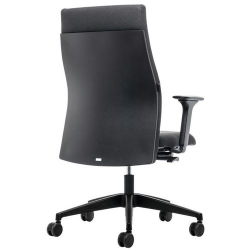 Krzesło biurowe z wysokim, wyściełanym oparciem, które można zablokować w pozycji przedniej i tylnej. Mechanizm synchroniczny z automatyczną regulacją napięcia w zależności od wagi użytkownika. Podparcie lędźwi z regulacją wysokości. Podłokietniki regulowane 4D. Płynna regulacja wysokości siedziska w zakresie od 405 do 510 mm.